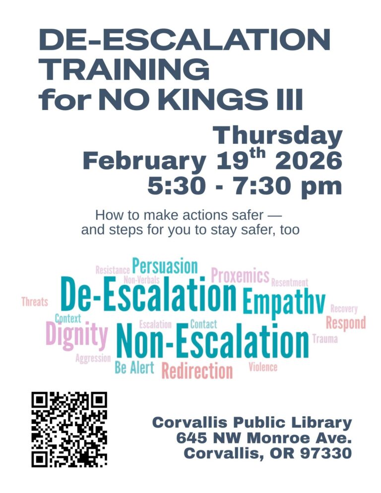 De-Escalation Training, TrainingDe-Escalation Training Feb 19 for NK3indivisiblebc Benton-CountySunday, February 15, 2026