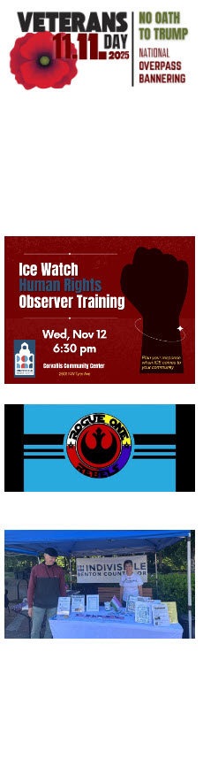 10-2pm : Linn Co. Veterans Day Parade – Salem Indivisible, East Linn Indivisible, will be marching in the Linn Co. Veterans Day Parade. They have invited Indivisible Benton County to march along with them in Solidarity. We need more people to march through the Parade and hold banners and signs. We will be marching with a banner, “Vets Defend The Constitution”. A message decided in partnership between Visibility Brigade and Veterans for Peace. If you can participate, please email [email protected] Attn: Esther – Veterans Day Parade